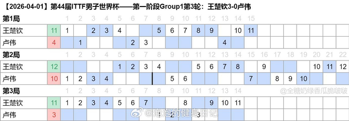 #王楚钦3比0卢伟#2026澳门世界杯,王楚钦状态火热。4月1日小组赛末轮,他以3-0(11-4、12-10、11-3)横扫澳大利亚选手卢伟,小组赛两连胜,以小组第一强势晋级16强。